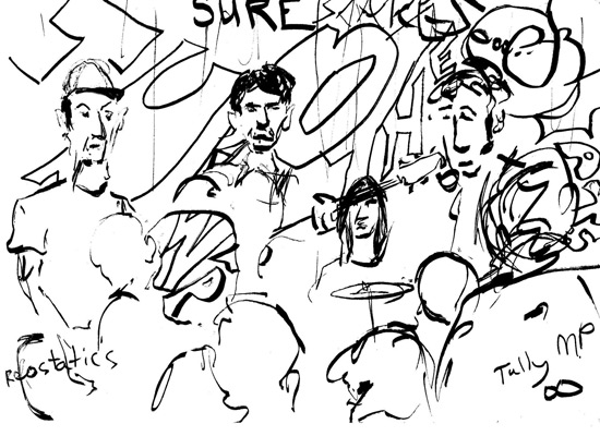Per Michael this was one of the best Rheos shows he ever saw. It must have been just before recording Night Of The Shooting Stars in winter 2000 as most of the songs on the album were played. Mumbletypeg lacked the spoken mid section "your love was a flower" part. "Rare original drawing by local artist "tully" drawn during the october 15 2000 rheos gig at the now defunct scherzo pub, kingston, ontario. the story goes that "tully" goes to shows, does a drawing of the band, and just leaves it on a random table for someone (like me!) to find it. i actually found it on the floor!"